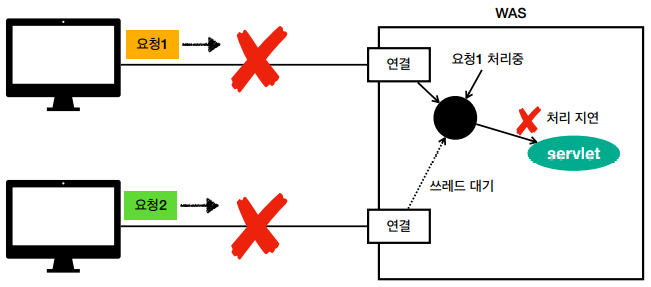 - 요청1이 와서 쓰레드를 할당하고 코드를 실행하는데 어떠한 이유로 처리가 지연되고 있다고 했을 때