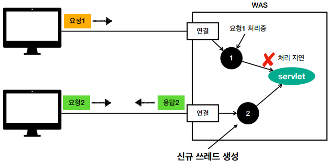 - 요청 1의 처리가 지연되고 있어도 요청2는 새로운 쓰레드를 통해 코드를 실행하기 때문에 같은 서블릿 객체를 호출해도 상관이 없다.