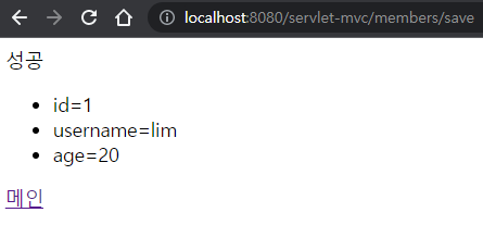 - 회원 등록 폼에 데이터를 입력하고 전송을 누르면 다음과 같이 저장 결과를 확인할 수 있다.