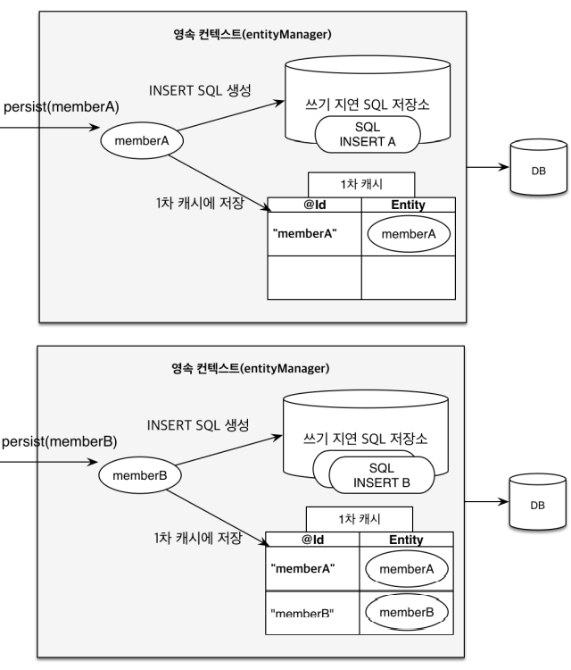 em.persist(memberB); // 쓰기지연 SQL 저장소에 저장