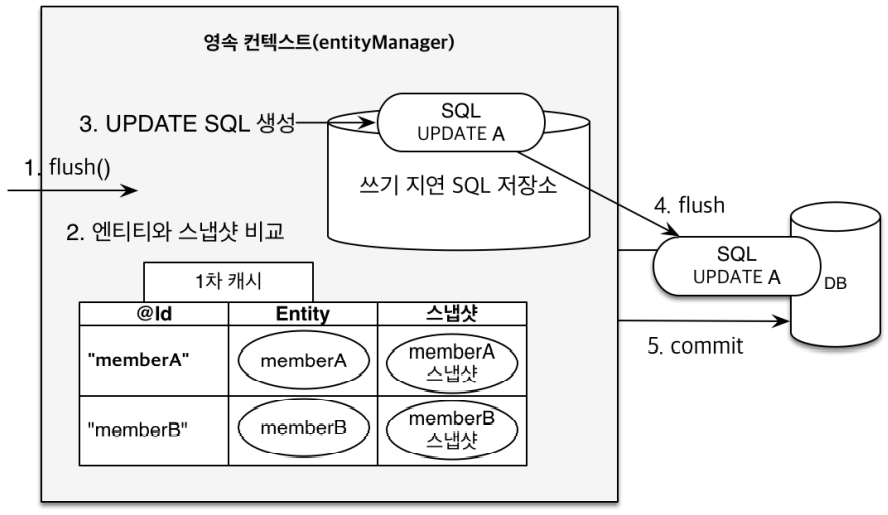 - JPA는 엔티티와 스냅샷을 비교해서 변경이 일어난 것이 있으면, UPDATE 쿼리를 생성해 쓰기 지연 SQL 저장소에 저장한다.