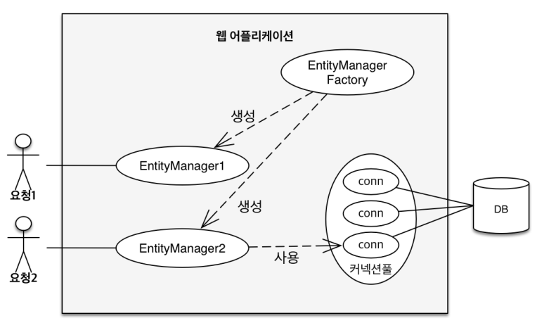 - EntityManagerFactory를 통해 고객에게 요청이 올 때 마다 EntityManager를 생성한다.