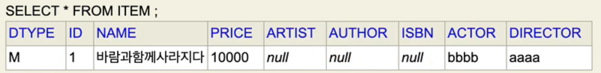 - @DiscriminatorValue("XXX") : 자식 클래스에 사용, DTYPE 값으로 사용할 이름 지정 (default=엔티티명)