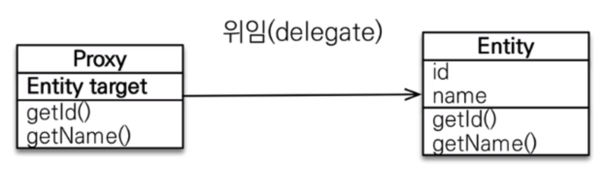 - 지연 로딩을 하려면 연관된 엔티티의 실제 데이터가 필요할 때 까지 조회를 미뤄야 하는데, 이때 연관관계로 가지고 있는 엔티티 필드에 null 값을 넣어둘 수는 없기 때문에 그 자리에 프록시 객체를 주입하여 실제 객체가 들어있는 것처럼 동작하도록 한다.