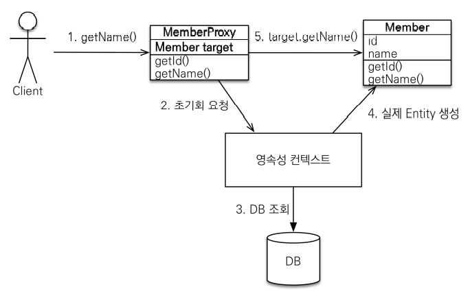 - 영속성 컨텍스트는 초기화 요청을 받으면 데이터베이스에소 실제 엔티티 객체를 조회해오고, 이를 target에 연결시켜 실제 객체의 메소드를 호출한다.