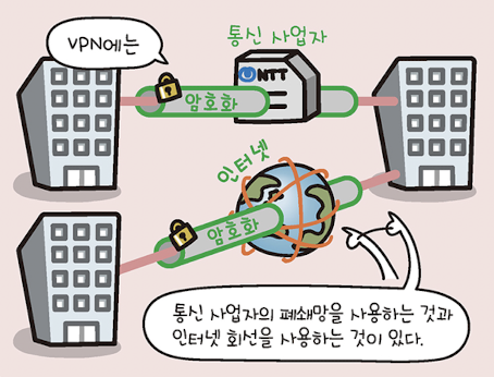 - VPN : 인터넷에 가상 전용선 공간을 만들고 거점 사이를 연결, 비용 저렴, 보안 주의 필요