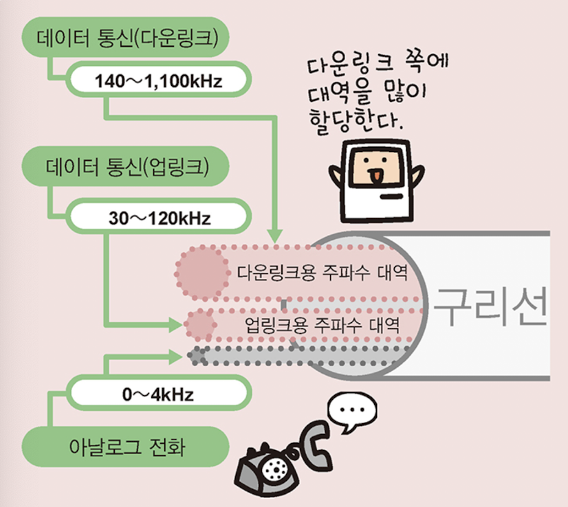 - 아날로그 전화는 구리선이 전송할 수 있는 주파수 대역의 겨우 몇 %밖에 사용하지 않으며, xDSL은 이 외의 주파수를 사용해 고속 통신을 수행한다. → 높은 주파수 대역 사용