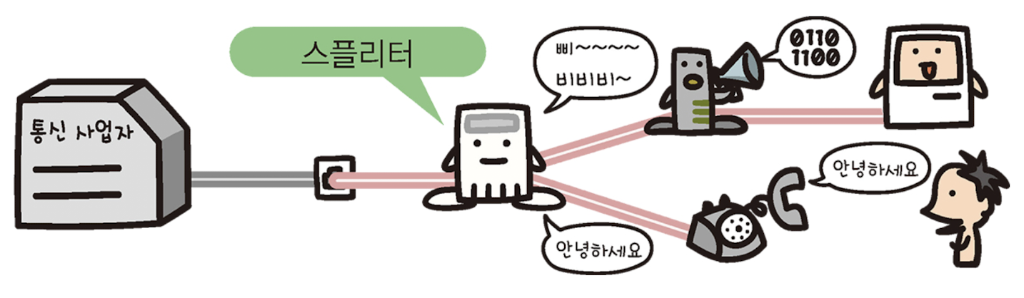 - xDSL로 통신하는 케이블의 양쪽 끝에 스플리터라는 기기를 설치하며, 이 기기가 주파수 대역에 따라 아날로그 통화와 데이터 통신 신호를 분리하기 때문에 음성 통화와 데이터 통신을 서로 간섭없이 동시에 할 수 있다.