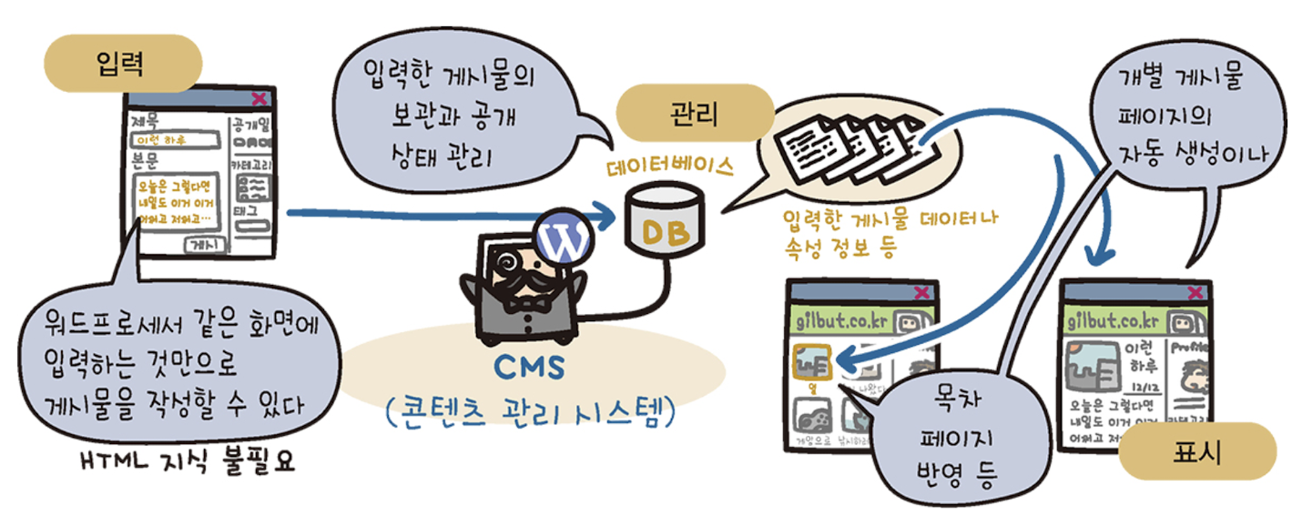 - 이전 웹 사이트 구축 시 콘텐츠와 사이트 구성이 밀접하게 연결되어 있으므로, 전문지식이 필요하고 구성을 유연하게 변경할 수 없었지만, CMS를 사용하면 콘텐츠의 입력 및 관리와 웹 사이트에서 보이는 부분의 처리까지 시스템이 관리해준다.
