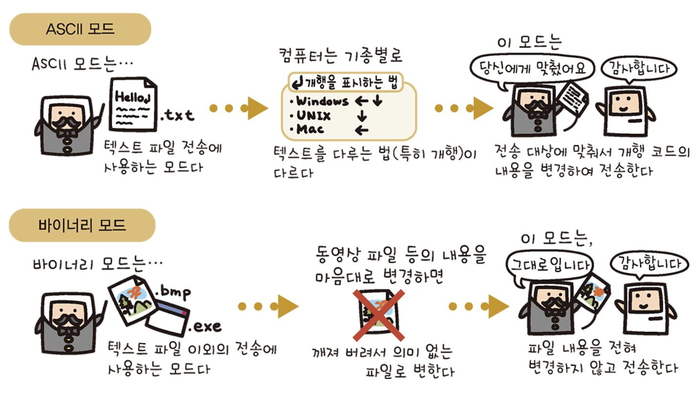 - FTP로 파일 전송 시 ASCII 모드와 바이너리 모드라는 두가지 모드 존재
