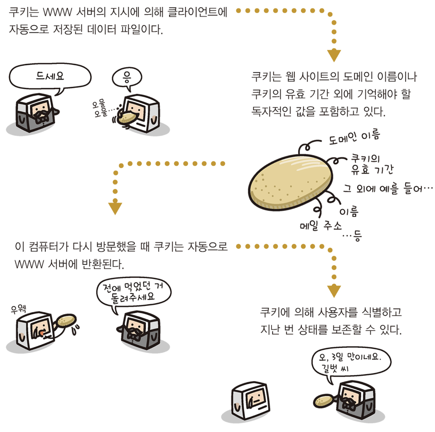 → 주로 사용자를 식별하는 것을 목적으로 이용 - WWW 서버의 지시에 따라 웹 브라우저가 클라이언트 컴퓨터에 쿠키를 저장하고, 쿠키에 의해 저장된 정보는 액세스한 URL이 쿠키의 정보와 일치할 경우 자동으로 WWW 서버로 전송된다.