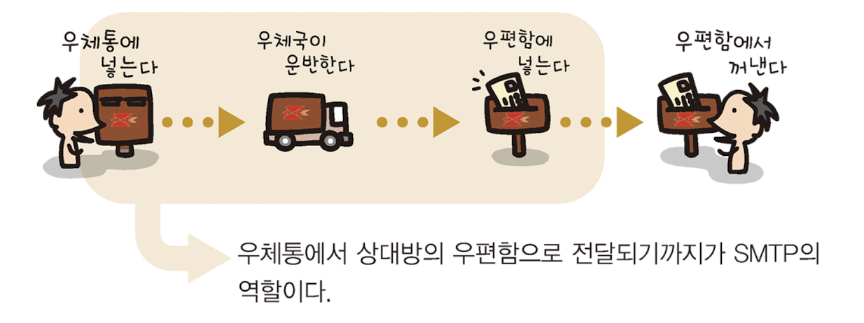 - 전자 메일을 보내면 보낸 사람의 STMP 서버로 데이터가 발송되고, 거기서는 SMTP 서버에서 대상 메일 서버로 전송되어 받는 사람의 메일 박스에 저장된다.