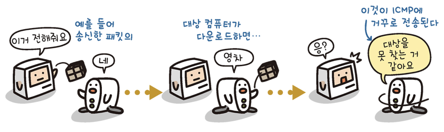 - 통신 중 에러가 발생하면 ICMP는 에러가 발생한 곳에서 패킷의 발송지로 에러 정보를 거꾸로 전송한다. 따라서 네트워크에서 발생한 오류 내용을 알 수 있다.