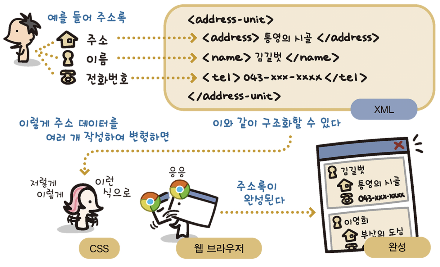 - XML은 문서 모양을 표현하는 태그가 없고, 단지 문서 구조 및 데이터의 속성을 표현하기 위한 태그만을 사용해 CSS 같은 스타일 시트 언어가 필수적이다.