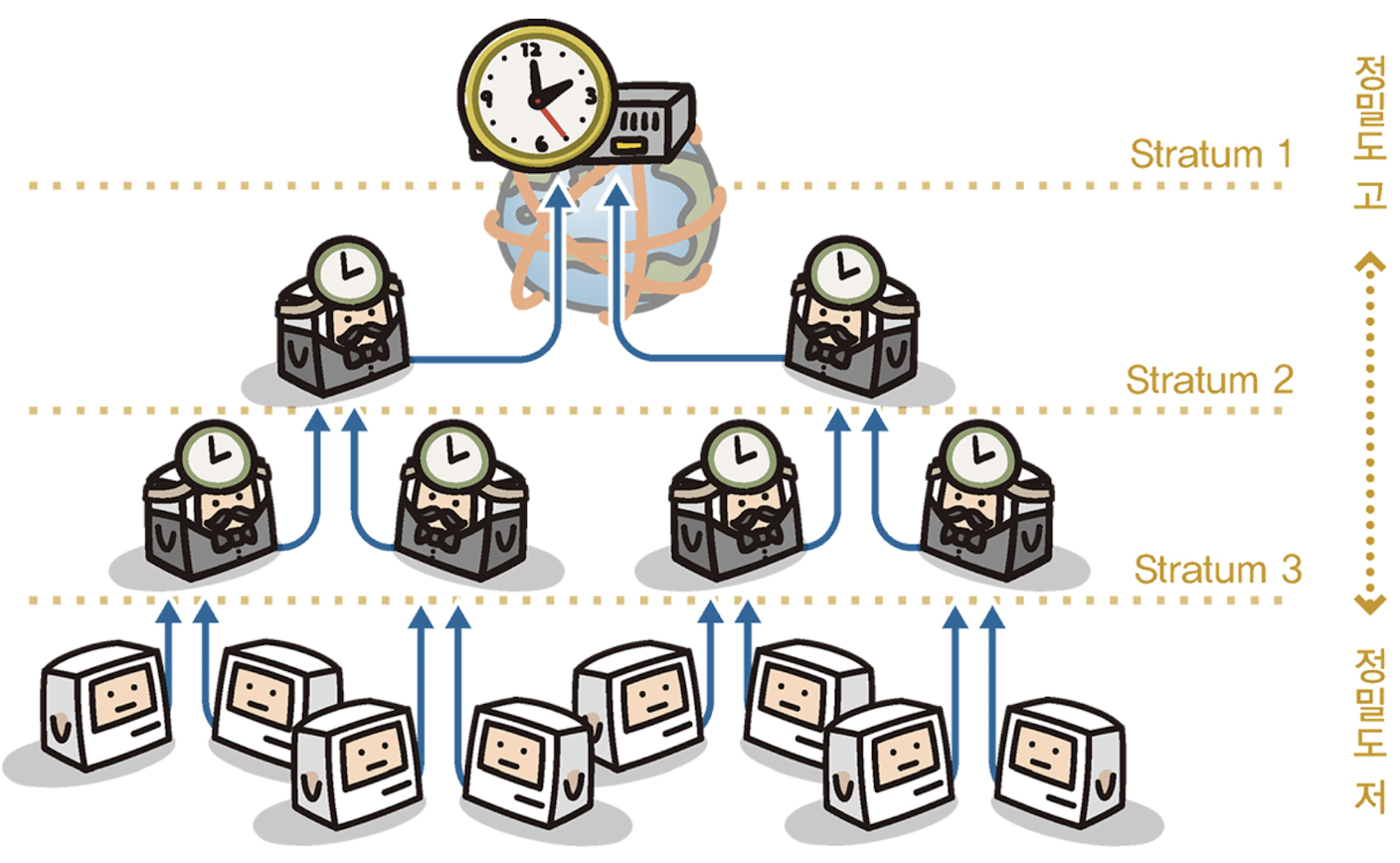 - NTP 서버는 계층 구조로 되어 있으며, Stratum 1부터 Stratum2, 3 ... 순서대로 15단계까지 계층화할 수 있다.