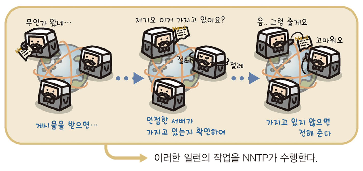 - 게시물 배포, 게시물 접수, 뉴스 서버간의 게시물 교환에 이용된다.