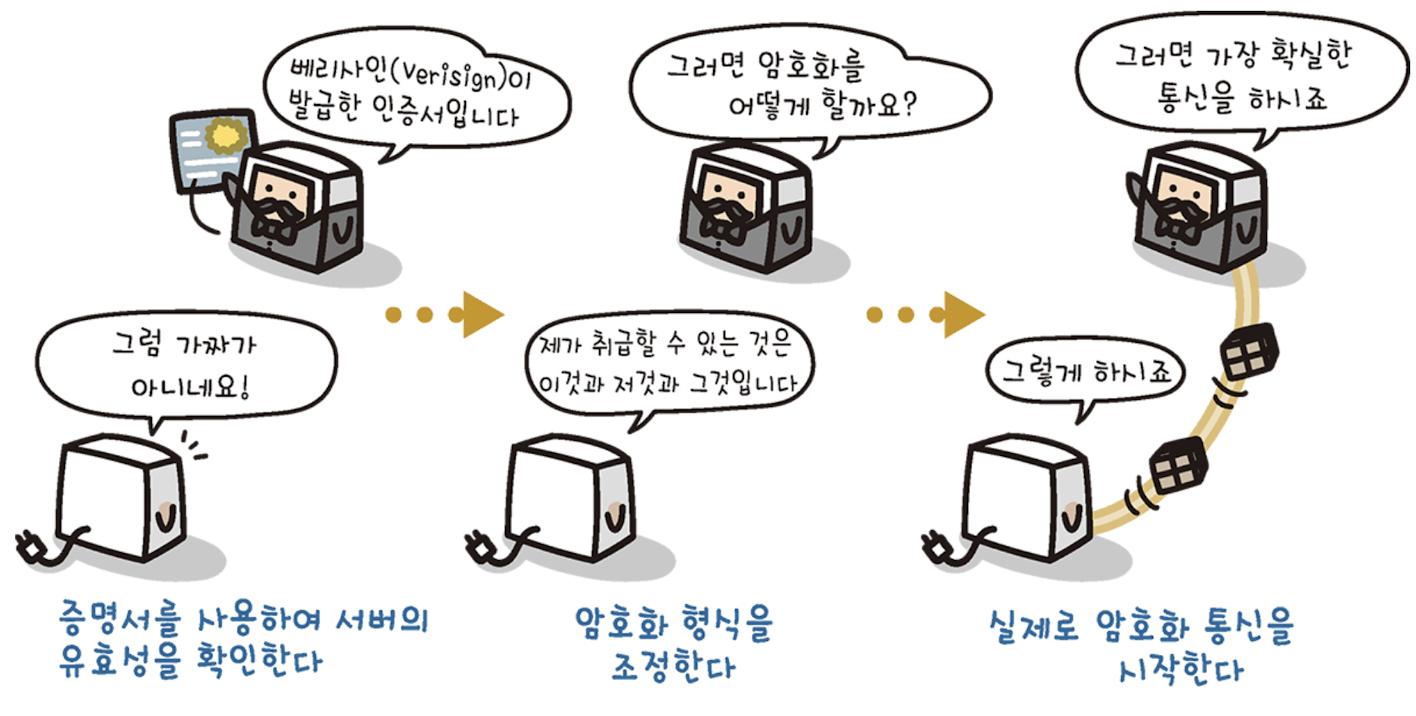 - 인터넷에서 안전하게 정보를 교환하기 위해 사용하는 암호화 프로토콜