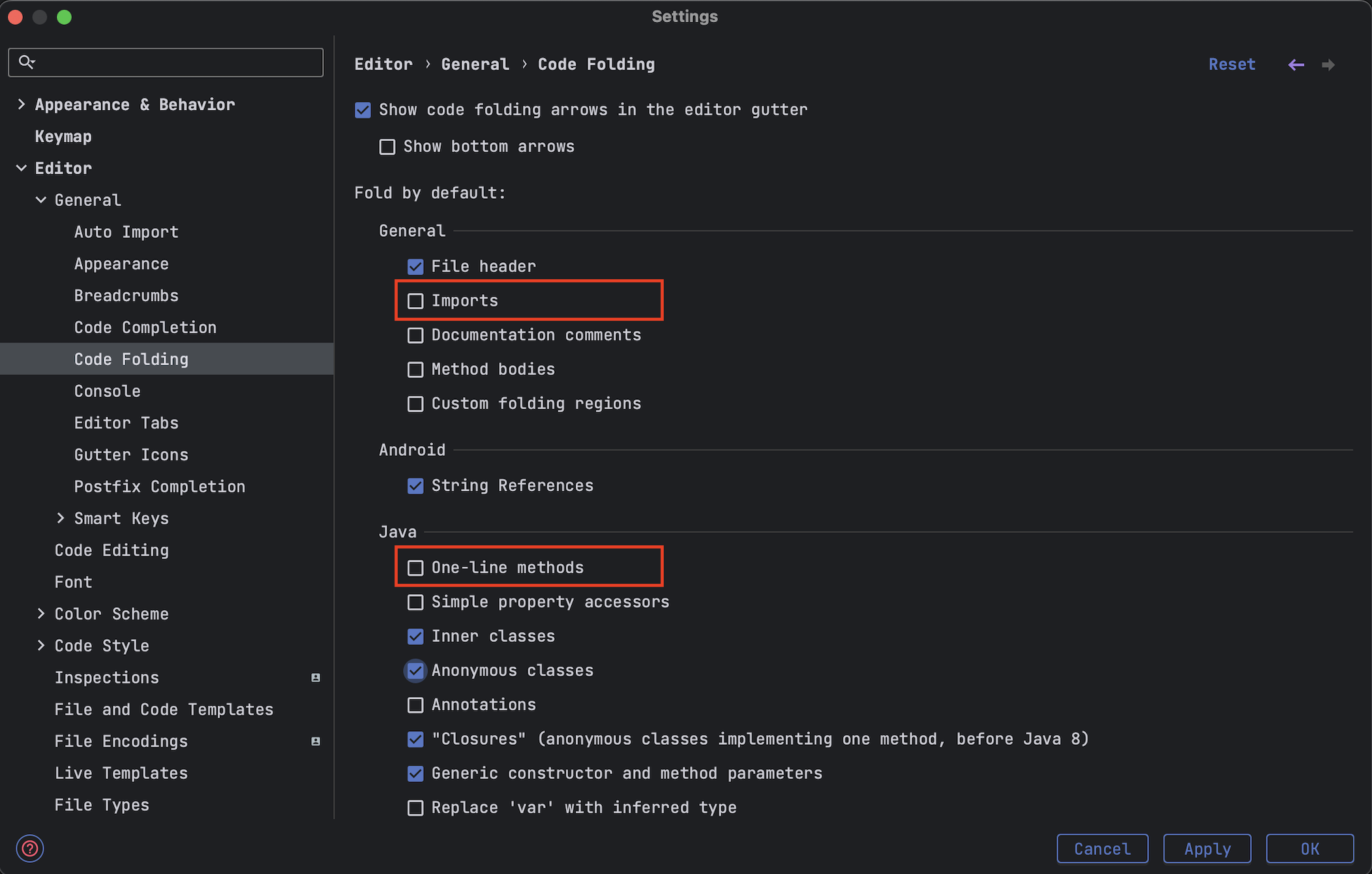 - Settings > Editor > General > Code Folding
