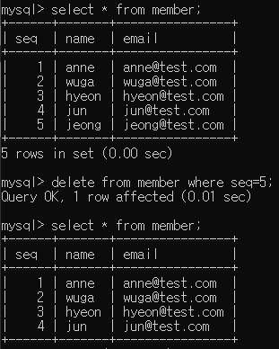 - where절을 생략할 경우 해당 테이블의 모든 데이터가 삭제된다.