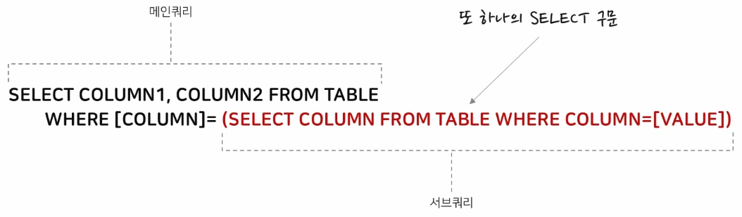 - 상위 SQL문을 메인쿼리, 하위 SQL문을 서브쿼리라 한다.