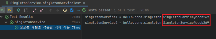 getBean() 메소드를 호출할 때 마다 같은 객체 인스턴스를 반환하는 것을 확인할 수 있다.