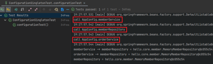 - call 로그를 찍어서 확인해보면 new MemoryMemberRepository();가 단 1번만 호출되어 싱글톤이 보장된 것을 확인할 수 있다.