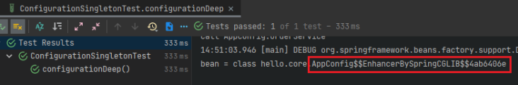 - 스프링은 @Configuration을 붙이면 클래스의 바이트코드를 조작하는 CGLIB 라이브러리를 사용해 싱글톤을 보장한다.
