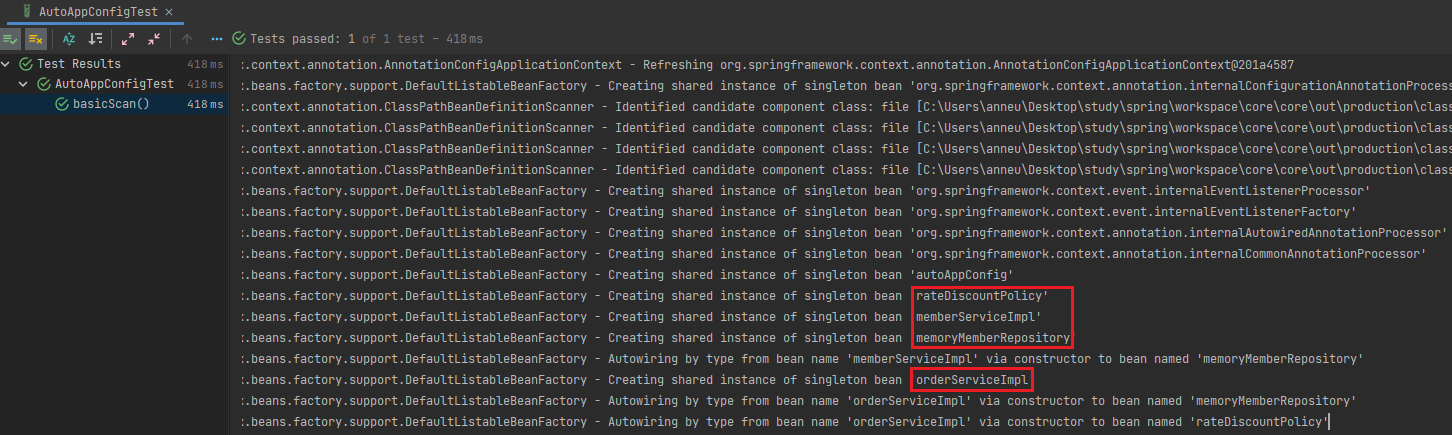 - 실행 로그를 보면 @Component가 붙은 클래스들이 스프링 빈으로 잘 등록된 것을 확인 할 수 있다.(싱글톤 사용)
