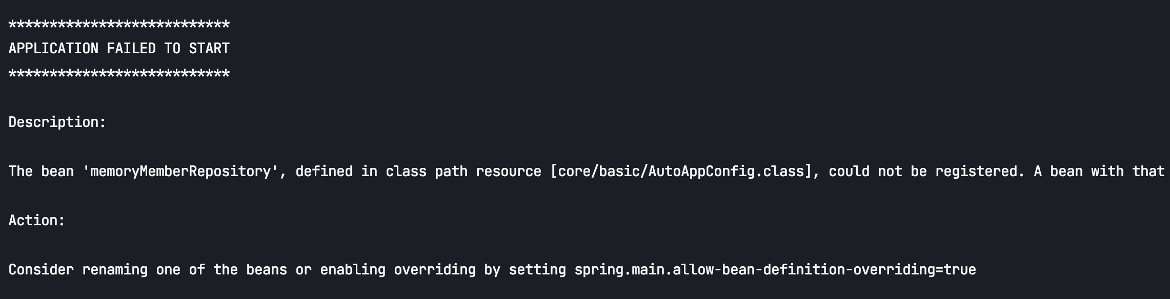 그래서 최근 스프링 부트에서는 수동 빈 등록과 자동 빈 등록이 충돌나면 오류가 발생하도록 기본 값을 변경했다.