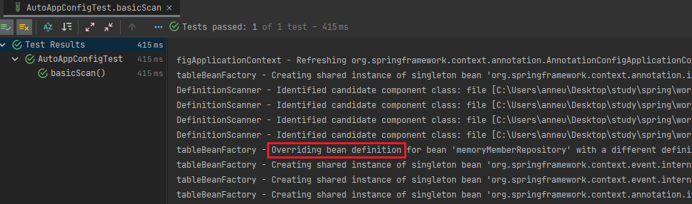 @Component에 의한 자동 빈 등록과 @Bean에 의한 수동 빈 등록에서 이름이 중복될 경우, 수동 빈 등록이 우선권을 가진다.