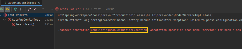 컴포넌트 스캔에 의해 자동으로 스프링 빈이 등록되는데, 이름이 같은 경우 스프링은 오류(ConflictingBeanDefinitionException)를 발생시킨다.