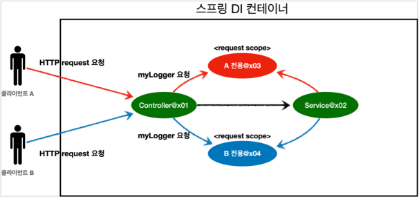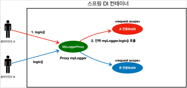 - 이렇게 하면 MyLogger의 가짜 프록시 클래스를 만들어두고 HTTP request와 상관 없이 가짜 프록시 클래스를 다른 빈에 미리 주입해 둘 수 있다.