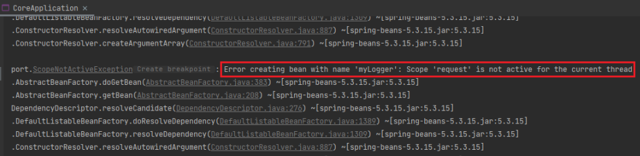 - request 스코프 빈은 애플리케이션 실행 시점에 생성되지 않고 아닌 고객 요청이 와야 생성된다.