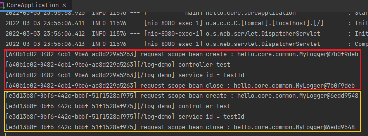 로그를 보면 같은 요청일 경우 동일한 스프링 빈임을 확인 할 수 있다.