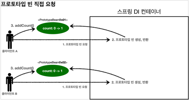 스프링 컨테이너테 프로토타입 스코프 빈을 요청하면 항상 새로운 객체 인스턴스를 생성해 반환해야 하지만, 싱글톤 빈과 함께 사용할 경우 의도한대로 동작하지 않아 주의해야 한다.