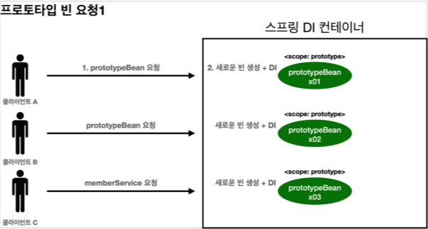 - 이후에 스프링 컨테이너에 같은 요청이 오면 항상 새로운 프로토타입 빈을 생성해서 반환한다.