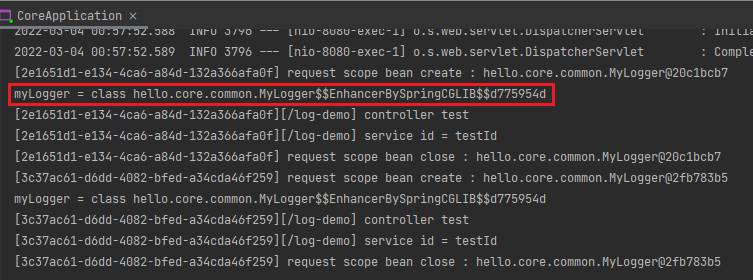 System.out.println("myLogger = " + myLogger.getclass()); // 주입된 myLogger 확인용