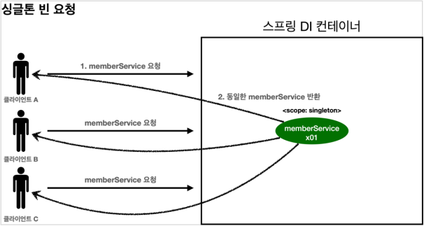 - 이후에 스프링 컨테이너에 같은 요청이 와도 같은 객체 인스턴스의 스프링 빈을 반환한다.