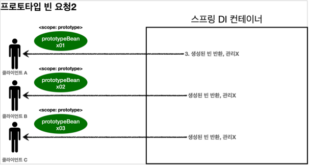 - 스프링 컨테이너는 생성한 프로토타입 빈을 클라이언트에 반환하면 더이상 관리하지 않는다.